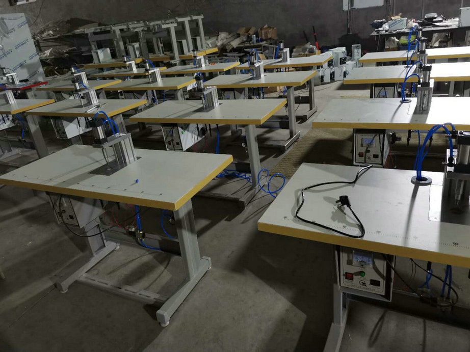 本機(jī)以超聲波將綁帶融合于口罩本體兩側(cè),進(jìn)而完成綁帶式口罩成品,只需一名操作員將口罩片置于超聲波發(fā)生器的頭上,后將綁帶放在口罩片上,腳踏踏板使氣缸向下運(yùn)動(dòng),縫住綁帶和口罩片。